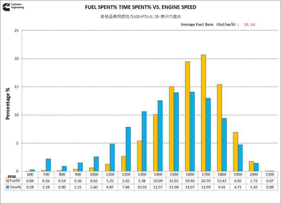 从Duty cycle分布看,车辆工况较恶劣,多运行在满负荷区域,相比之下福康X12发动机在外特性运行占比稍少,得益于X12-430发动机比其他品牌动力扭矩更大,具备更优的道路坡度适应性,动力性占优势。