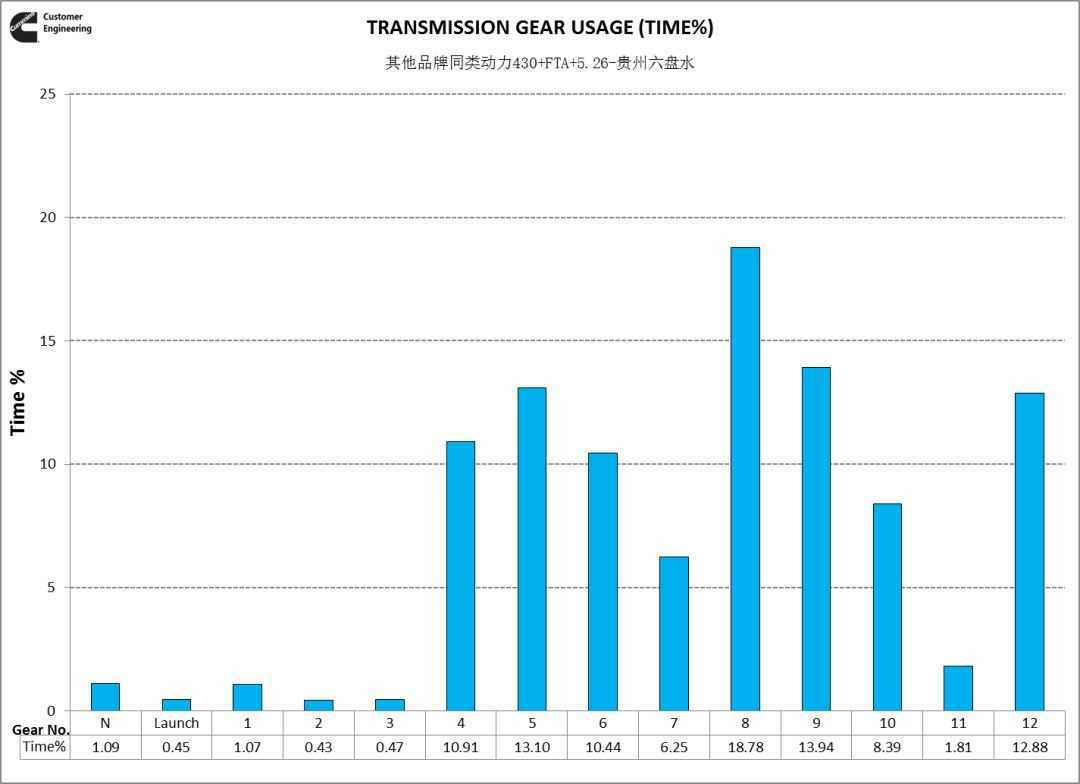 从爬坡工况转速分布看,福康X12动力转速重心在1500rpm,其他品牌动力转速重心在1600~1700rpm,福康X12动力使用转速更低。这就是福康低转速大扭矩的特性,可以让司机选择高一个挡位运行,降低了发动机转速,当然好处就是不仅满足动力性需求,还节油。