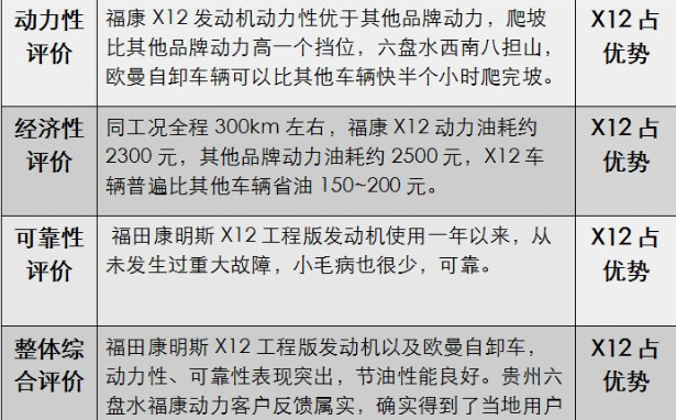 数据分析结果显示:配置福康X12动力的欧曼自卸车辆经济性在全程运行和爬坡运行两个工况均优于其他车辆。